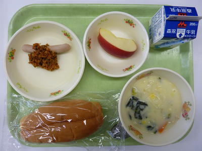 セルフチリドッグ、白菜のクリームスープ、りんご、牛乳