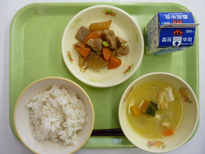 豚角煮、カボチャの味噌汁、麦ご飯、牛乳
