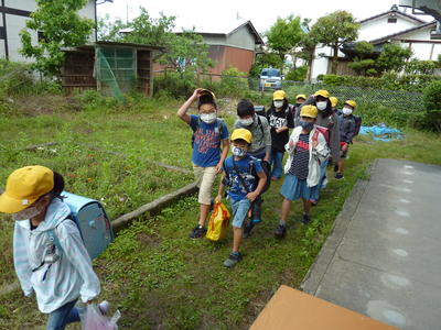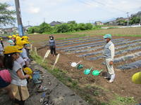 1,2年生は学校の前の「木倉小農園」で夏野菜の苗うえをしました。
