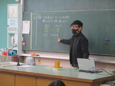 3年生の理科はものの重さの学習をしています。先生が取り出したのは直方体の木でできた積み木、縦長にして重さを量ったときと横長にして重さを量ったときでは重さは違うでしょうか?と発問しました。大人なら同じだろうと考える人が多いかもしれませんが、子どもたちは様々な意見を理由を付けて発表します。「測る面積が大きくなるから重くなる」「面積が大きくなると軽くなる」「変わらない」などの意見がたくさん出ました。そして実験、結果は「変わらない」でしたが、一所懸命に予想した子ども達は興味津々で実験を見ていました。