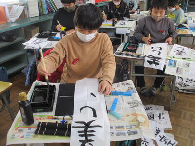 4年生は、条幅紙に「美しい空」と書き初めをしました。