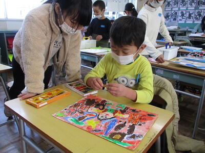 花びら1枚1枚をクレヨンで、はみ出さないようにていねいにぬり、カラフルな色で華やかな花の絵を完成させていきました。みんな集中してがんばり、自信作が完成すると達成感でいっぱいになっていました。6年生が喜ぶ顔が浮かんできます。
