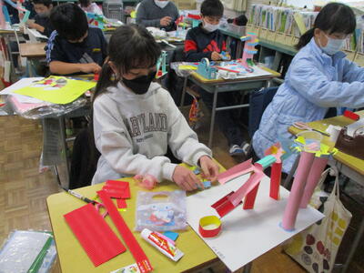 5年の図工は、「ころがるくんの旅」を製作しています。様々な紙や段ボール素材をうまく使い、ビー玉が転がっていく夢の滑り台を作っています。