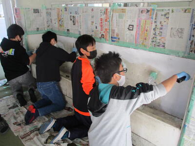プロジェクトの一つとして「廊下の掃除と塗装」と「流しの掃除と塗装」があります。まず、デッキブラシで汚れを落とし、ローラーやはけで感謝の気持ちを込めて白ペンキで塗装しました。