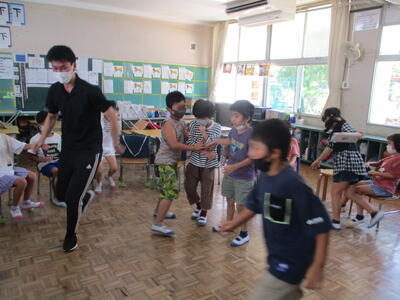 3年生の教室では、担任の先生とクラスみんなで遊んでいました。先生も安全に配慮しながら一緒に楽しむ姿がありました。担任の先生も子ども達も笑顔でいっぱいです。