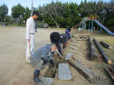 この日は、チェーンソーなどを使い、父親の皆さんでどんどん遊具を撤去していきました。遊具撤去の後は、樹木の伐採を20本以上していただきました。さらに、運動場の溝に溜まった砂の撤去もしていただきました。最後は、掘った穴などを丁寧に砂等で埋めて、子ども達にとって安全な運動場にしていただきました。本当にありがとうございました。