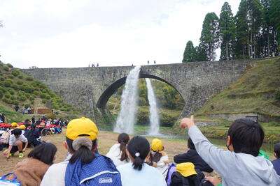 石匠館では石工達の巧みな技や石橋づくりにかける思いや願いなど、実際の資料を見ながら学習しました。通潤橋では、実際に豪快な放水を見ることができ、その技術の高さやすばらしさを肌で感じていました。円形分水では、川からの水を通潤橋と川下の地域に水を平等に分ける仕組みを学習し、当時の水の大切さを改めて感じることができました。