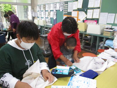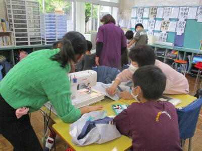 6年生の家庭科はエプロン製作です。6年生は手縫いだけでなく、ミシンも使ってエプロンを製作します。この日は、昨年度も来校していただきました学習応援団の方々が今年も来校され、ミシンの使い方や手縫いの仕方などの学習のお手伝いをしていただきました。