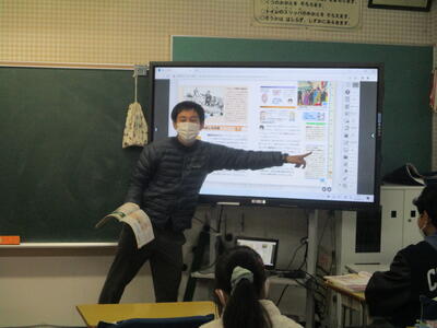 この日の6年生の教室では新しい日本づくりを熱い思いで進めている明治時代の学習が行われていました。授業始めのスイッチオンタイムでは前の時間に学習した条約改正のきっかけともなったノルマントン号事件や日本がトルコの船救出したエル・トゥールル号事件など電子教科書活用して楽しく復習しました。