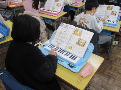 コロナが落ち着き、2年生の教室からは鍵盤ハーモニカの軽快なメロディーが流れてきました。2年生の教室に入ると、子ども達が一斉に「子ぎつね」を鍵盤ハーモニカで合奏していました。