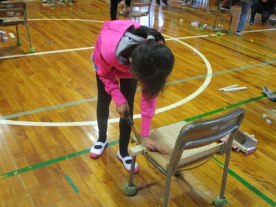 2年生の横は体育館です。体育館の中から「ギコギコ」、のこぎりを引く音が一斉に聞こえてきました。体育館へ行くと体育館いっぱいに子供用の椅子がきれいに並べられ、壮観な眺めでした。4年生の子ども達は椅子の上の木材の上に片方の足をしっかり乗せ、一生懸命にのこぎりで角材を切っていました。力強く、集中していました。「馬を作るよ」「犬を作るよ」「へびを作るよ」「バスを作るよ」と言いながら切っていきました。