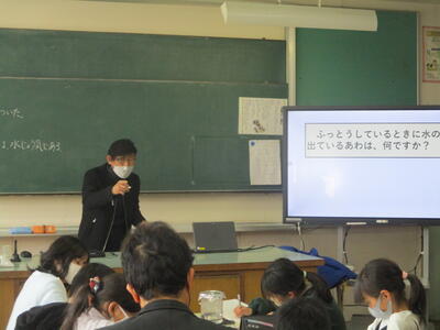ガスコンロで水を温めると水の中からぶくぶく泡が出てきました。先生の「この泡の正体は何でしょう」の問いに、子どもたちは「水蒸気」と答えました。「そうです、水蒸気です。水蒸気だから目に見えないのです」とテンポよく復習をしていきました。