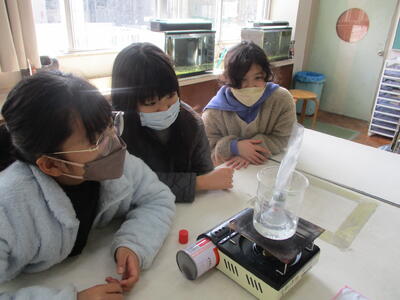 4年生の理科は「すがたを変える水」を学習しています。この日はグループごとにガスコンロでビーカーの水をあたためて沸騰させたり、出てきた泡をビニール袋に集めたりする実験をしました。