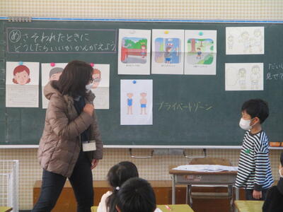 1年生の「からだをせいけつに」では、汚れやすいところやプライベートゾーンを確認し、どのようにしてきれいにするかをみんなで考えました。「誘いにのらない」では、不審者に出会ったときの対応について学習しました。子どもたちからは「大きな声を出す」「逃げる」などの意見が出ました。「いかのおすし」についても学習しました。