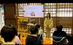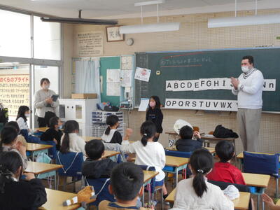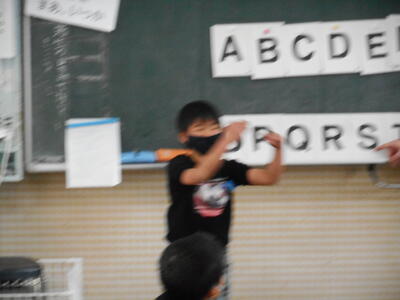 この日は「アルファベットを知ろう」ということでA、B、C‥…のアルファベットの言い方をALTの先生と楽しく学んだ後は、アルファベットの形から親しんでいこうということで、身体全体でアルファベットの形を表現し、みんなが当てるというゲームをしました。2年生の子どもたちは全身をくねらせたり、曲げたりして「S」「C」などのアルファベットのクイズを出し、回答する子どもたちも笑顔と拍手いっぱいの教室になりました。