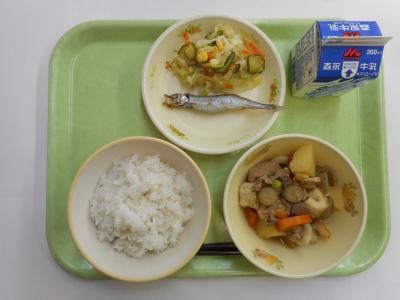 麦ごはん、ピリッとうま煮、焼きししゃも、レモン和え、牛乳