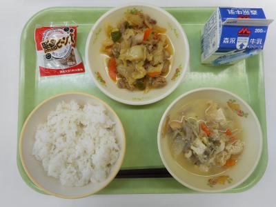 麦ごはん、根菜のごま汁、焼き肉風炒め、黒糖ビーンズ、牛乳