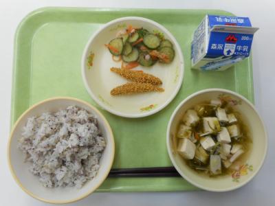 梅じゃこごはん、あおさ汁、きびなごのカリカリフライ、たこの酢の物、牛乳