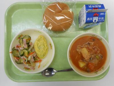 丸パン、鶏肉のトマト煮、ほうれん草オムレツ、ハムマリネ、牛乳