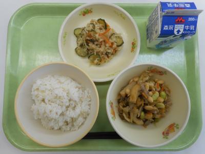麦ごはん、大豆の磯煮、切干大根の酢の物、牛乳