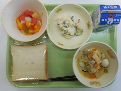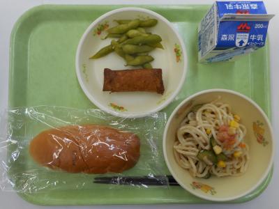 ミルクパン、冷やし中華、春巻き、えだまめ、牛乳