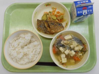麦ごはん、豆腐汁、さばのごま焼き、もやしカレーサラダ、牛乳