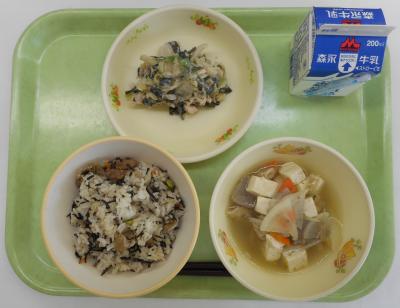 ひじきごはん、けんちん汁、御船川とささみのごまサラダ、牛乳