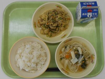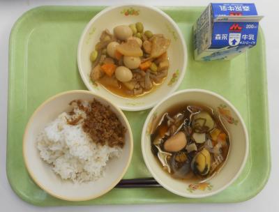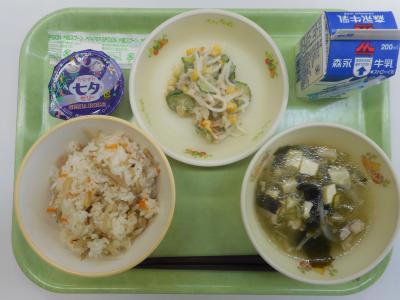 麦ごはん、御船川ともずくのスープ、鶏のさっぱり煮、かつおふりかけ、牛乳
