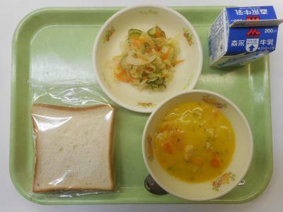 食パン、かぼちゃのポタージュ、キャベツパインサラダ、牛乳