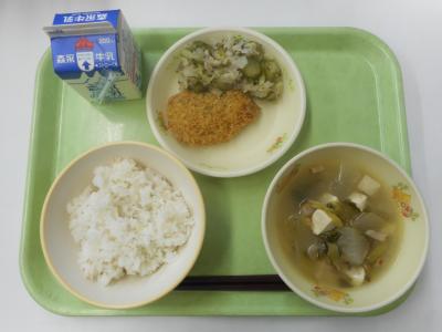 麦ごはん、冬瓜スープ、県産真鯛の磯部フライ、キャベツのゆかり和え、牛乳