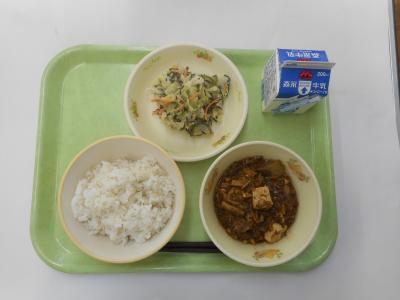 麦ごはん、なす入りマーボー豆腐、ひじきのマヨサラダ、牛乳