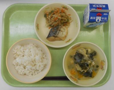 麦ごはん、夏野菜のみそ汁、さばの生姜煮、もやしのごま和え、牛乳