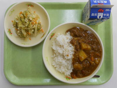うまカレー(麦ごはん)、うまカレールウ、じゃことナッツのサラダ、牛乳