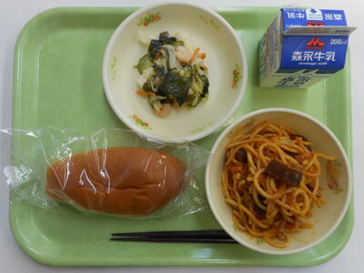 ミルクパン、なすのミートスパゲティ、シーフードサラダ、牛乳