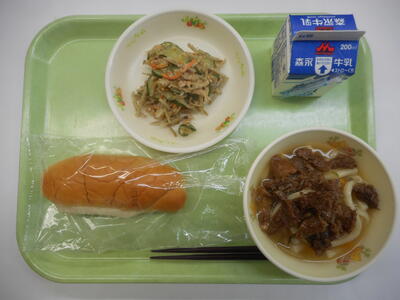 ミルクパン、馬肉うどん、ごぼうサラダ、牛乳