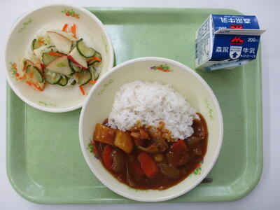 カレーライス、キャベツとりんごのサラダ、牛乳