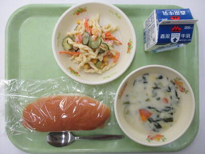 コッペパン、白菜のクリーム煮、マカロニサラダ、牛乳