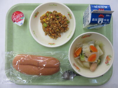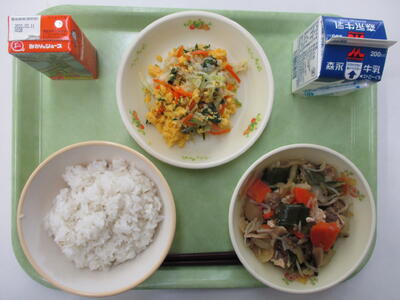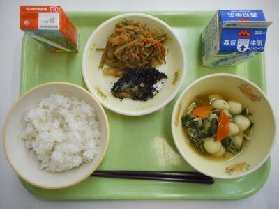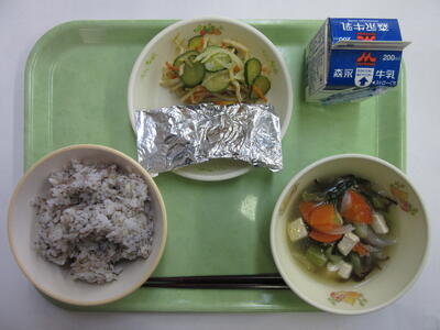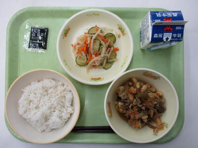 麦ごはん、大豆の磯煮、ごま酢あえ、ひじきのり、みかん果汁、牛乳