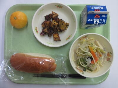 ミルクパン、ちゃんぽん、大学芋、みかん、牛乳