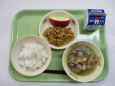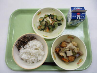 麦ごはん、牛乳、肉と野菜の旨煮、いかの酢味噌あえ、手作りカル鉄ふりかけ
