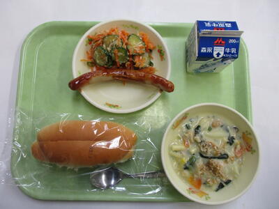 「キャロットラぺ」はせん切りにした人参のサラダで、塩や酢・オリーブオイルなどで味付けをします。フランス発祥のサラダでメイン料理に添えられていることが多いです。にんじんは栄養もありますが、料理の彩りもよくしてくれるので、給食でもほぼ毎日使う食材の一つです。今日はウインナーと一緒にパンにはさんで食べてもおいしいですよ。