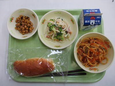 ミルクパン、スパデッテイーナポリタン、大根サラダ、座禅豆