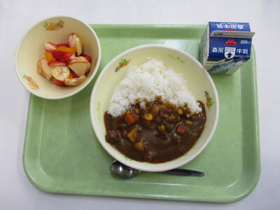 今日は御船小4年生が外国語の授業で紹介してくれた「我が家のオリジナルカレー」と「オリジナルフルーツポンチ」です。カレーは4年2組の古田なおやさんのおうちのカレーを再現しました。隠し味にコーヒーとしょうゆが入っていて玉ねぎとコーンがよく合うカレーです。それから、「フルーツポンチ」は4年1組の新原ゆなさんが考えた、「ジューシーで色あざやか、心がほっとするみんな大好きで栄養満点フルーツポンチ」です。また、お米は御船小の4年生が田植えをし、収穫したお米です。御船小4年生のスペシャルメニューを味わって食べてください。