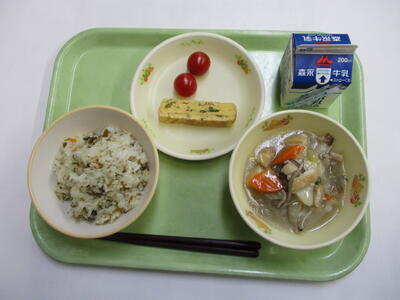 高菜めし、牛乳、だご汁、千草焼、ミニトマト