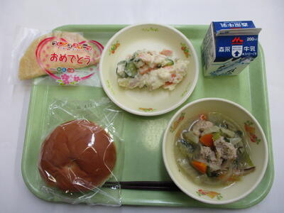 丸パン、牛乳、手作り肉団子スープ、ポテトサラダ、お祝いクレープ