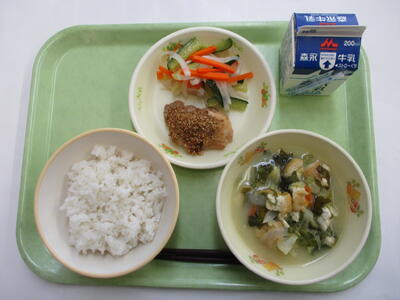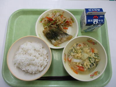 麦ご飯、牛乳、かき玉汁、ホキの和風ソース、春野菜のおかかあえ