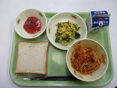 食パン、牛乳、スパゲッティーミートソース、グリーンエッグサラダ、手作りいちごジャム