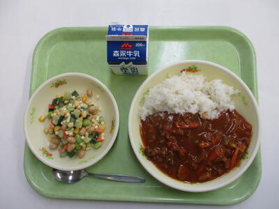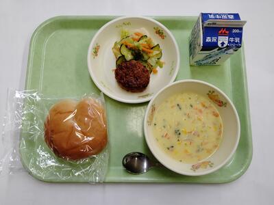 今日は入学・進級をお祝いしてデザートをつけました。黙食の中ですがクラスのみんなで入学や進級をお祝いしながら食べてください。また、ポテトサラダはパンにはさんで食べるとおいしいですよ。給食のパンは味がなくてそのままだと食べにくいという声も聞きますが、おかずを挟んだり、スープに浸したりしながら、工夫して食べてください。