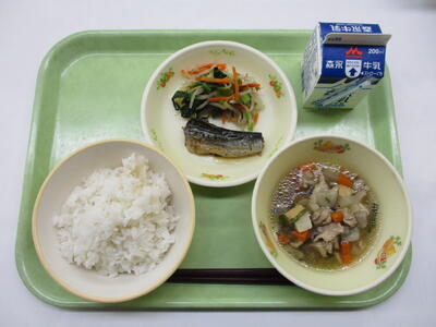 麦ごはん、牛乳、のっぺい汁、いわしの生姜煮、小松菜の昆布あえ