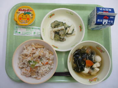たけのこごはん、牛乳、うずらの卵のすまし汁、いかの酢味噌あえ、熊本産ばんかんゼリー